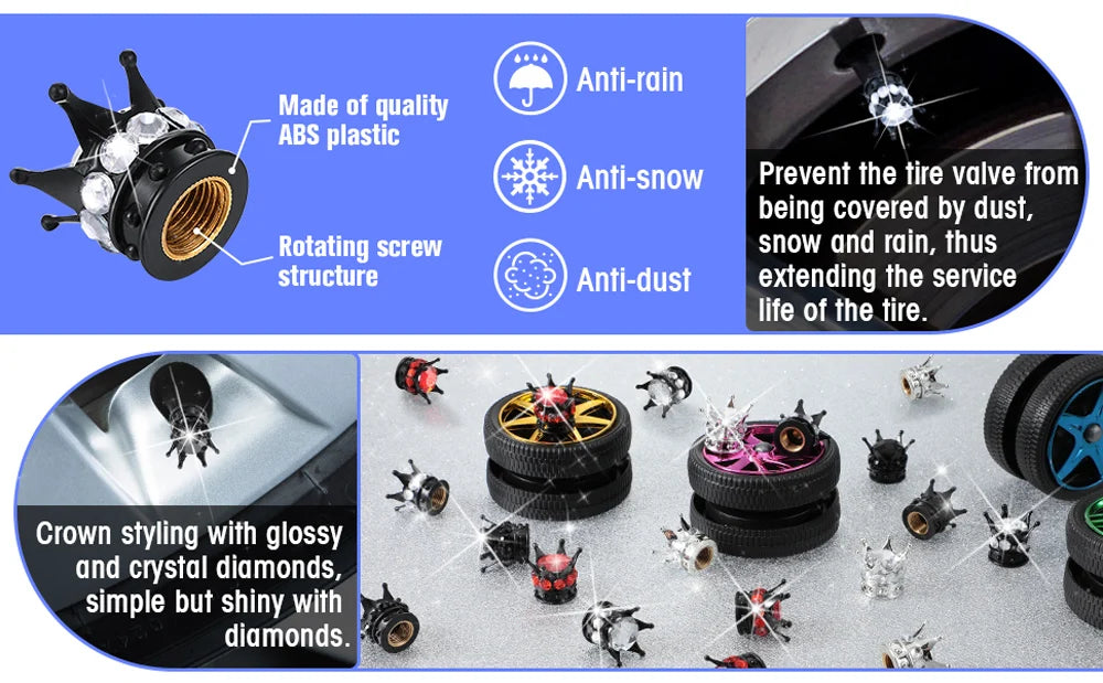 The inside of the bonnet is made of high quality ABS plastic, coated with polymer clay and inlaid with rhinestones. Wear-resistant and corrosion-resistant, can effectively prevent the tire valve from being covered by dust, snow and rain, and prolong the service life of the tire